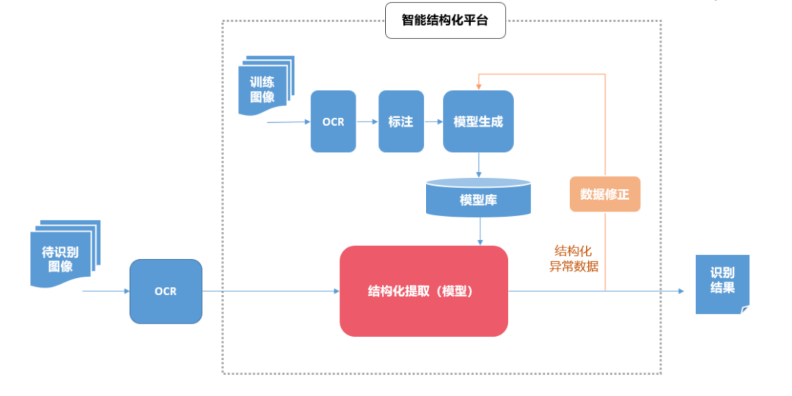 在易道博識(shí)智能結(jié)構(gòu)化平臺(tái)中,會(huì)提前將訓(xùn)練圖像通過OCR和標(biāo)注,生成數(shù)據(jù)模型并集成模型庫,用于應(yīng)對(duì)生產(chǎn)中的結(jié)構(gòu)化提取。如果過程中出現(xiàn)異常數(shù)據(jù),平臺(tái)會(huì)自動(dòng)將數(shù)據(jù)抓取并修正,重新進(jìn)行模型生成,完成一個(gè)內(nèi)部閉環(huán)。并且根據(jù)閉環(huán)進(jìn)行模板自行調(diào)整,不斷提升結(jié)構(gòu)化水平。