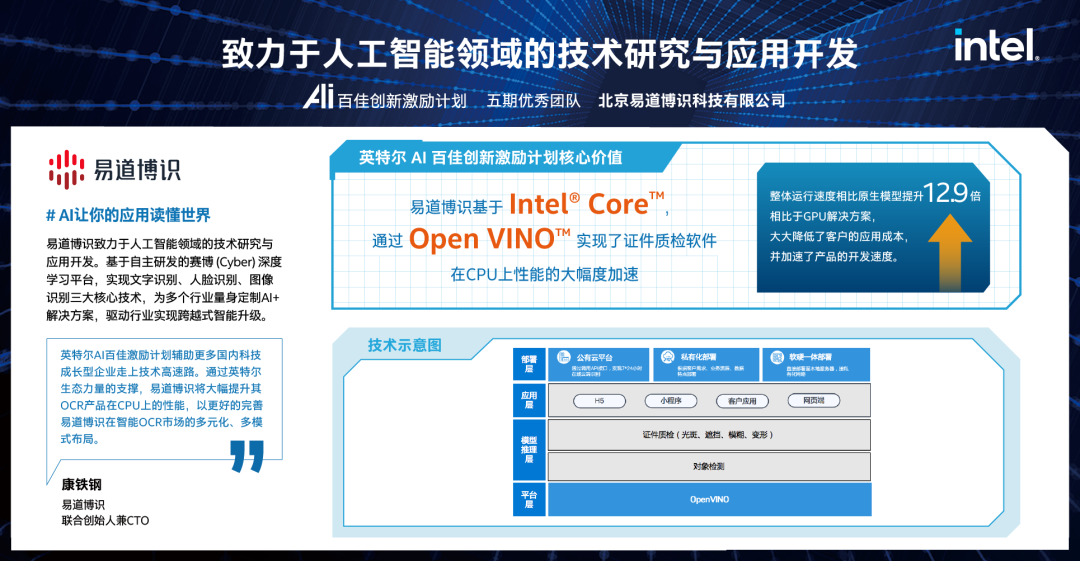 “基于深度學(xué)習(xí)的證件質(zhì)檢需要消耗大量的算力及技術(shù)資源,因此通常只有在服務(wù)器端才能有良好的服務(wù)表現(xiàn)。這次能在CPU上取得這樣的成功是非常難能可貴的?!笨佃F鋼介紹道。