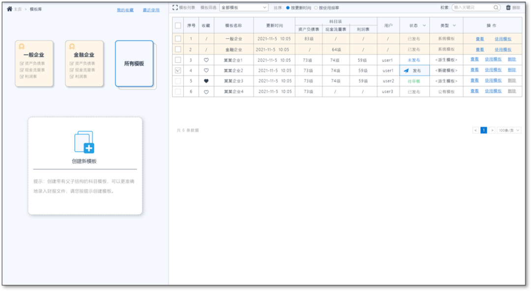 為滿足客戶需求,新建模板支持客戶自己創(chuàng)建標準的財報報表模板。我們引入模板共享理念,倡導(dǎo)共享更高效更簡潔的模板,但也會嚴格把控發(fā)布的質(zhì)量。