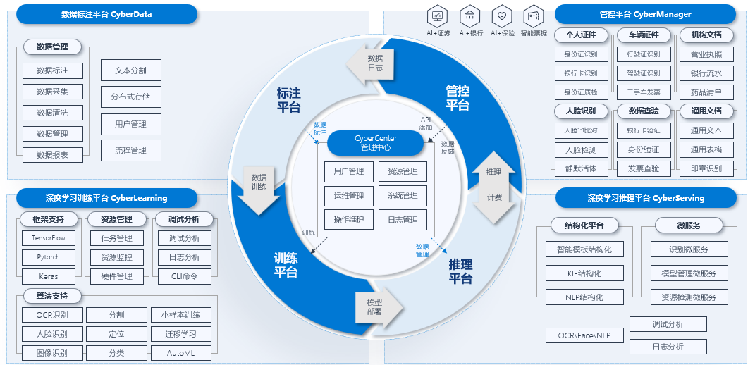 賽博學(xué)習(xí)平臺是易道博識開發(fā)的一站式智能化平臺,能夠從客戶需求分析到解決方案部署形成獨(dú)立的閉環(huán), 構(gòu)建端到端的工作流,利用現(xiàn)有的經(jīng)過長期迭代的基礎(chǔ)模型能力,完成數(shù)據(jù)標(biāo)注、數(shù)據(jù)治理、數(shù)據(jù)應(yīng)用、模型訓(xùn)練、模型測試、模型推理的全棧式流水線生產(chǎn)。