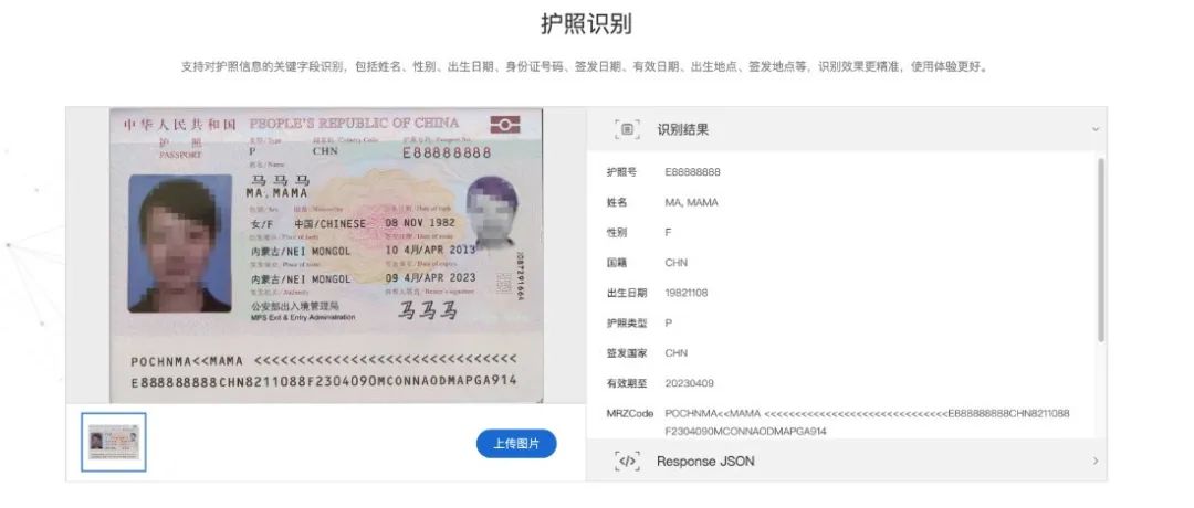 支持對護(hù)照國家碼、護(hù)照號、姓名、姓名拼音、性別、出生地點(diǎn)、出生日期、簽發(fā)地點(diǎn)、簽發(fā)日期、有效期、簽發(fā)機(jī)關(guān)等全字段信息識別輸出。