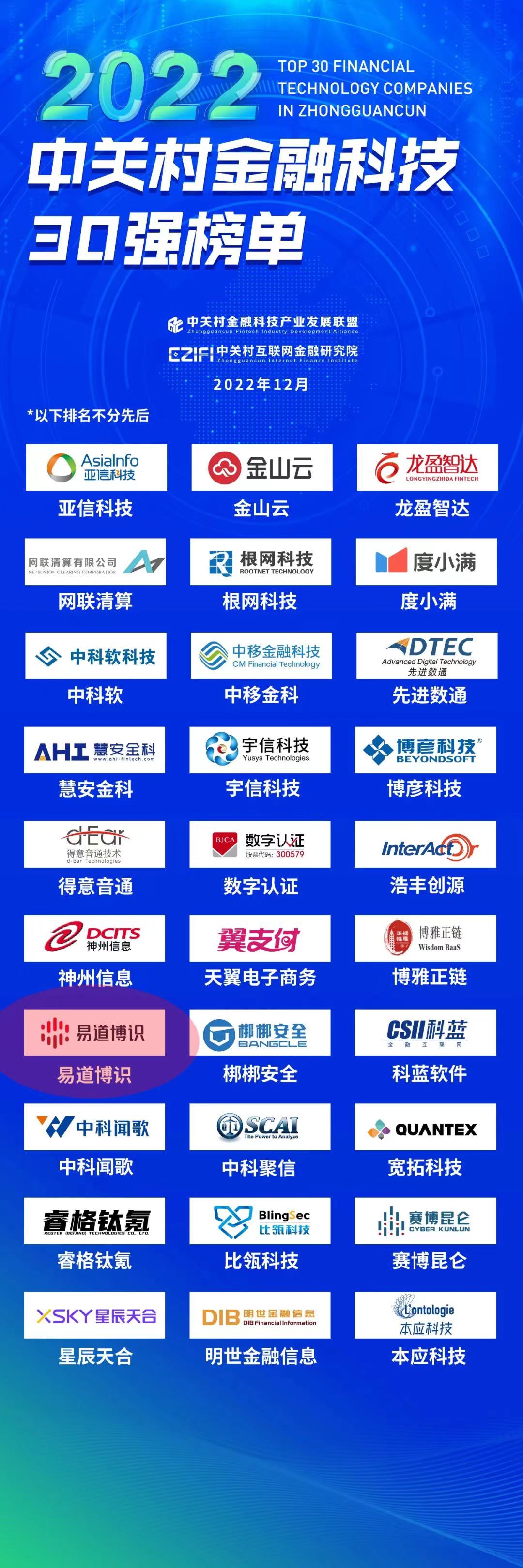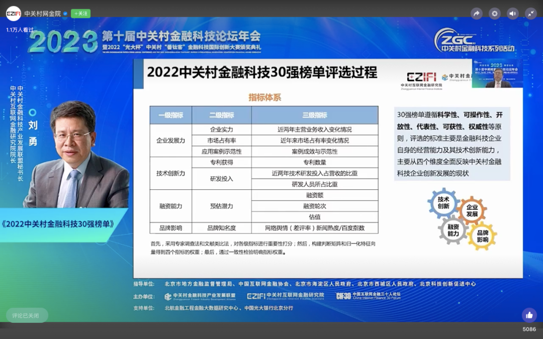 2022年12月13日-14日,由中關(guān)村金融科技產(chǎn)業(yè)發(fā)展聯(lián)盟、中關(guān)村互聯(lián)網(wǎng)金融研究院、中國互聯(lián)網(wǎng)金融三十人論壇共同主辦的“2023第十屆中關(guān)村金融科技論壇年會暨2022‘光大杯’中關(guān)村番鈦客金融科技國際創(chuàng)新大賽頒獎典禮”?在“云端”盛大舉行。本次論壇采用全新線上方式,匯聚行業(yè)學(xué)者精英,聚焦金融科技前沿?zé)狳c(diǎn)問題及發(fā)展趨勢,并見證了由中關(guān)村互聯(lián)網(wǎng)金融研究院和中關(guān)村金融科技產(chǎn)業(yè)發(fā)展聯(lián)盟共同主辦的《2022中關(guān)村金融科技30強(qiáng)榜單》(簡稱“2022年30強(qiáng)榜單”)的發(fā)布。