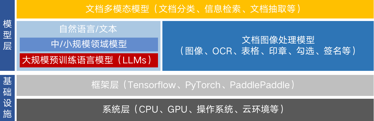 多模態(tài)能力和領(lǐng)域?qū)W習(xí)能力等方面的要求,決定了通用IDP系統(tǒng)是一個復(fù)雜的綜合性軟件系統(tǒng),對于技術(shù)架構(gòu)和系統(tǒng)設(shè)計提出了很高的要求。架構(gòu)上,IDP系統(tǒng)需要能夠兼容各種深度學(xué)習(xí)框架,并能夠?qū)τ诟鞣N預(yù)訓(xùn)練大模型、多模態(tài)預(yù)置模型和用戶自訓(xùn)練的領(lǐng)域模型實現(xiàn)有效的模型治理。并且,能夠以統(tǒng)一的模型能力層,向文檔應(yīng)用層提供接口,滿足上層智能化應(yīng)用的調(diào)用需求。大語言模型在智能文檔處理中的價值與挑戰(zhàn)如下圖,是一個常見的IDP系統(tǒng)模型技術(shù)棧。可以看出,LLMs僅僅是在自然語言文本這個模態(tài)上,作為預(yù)訓(xùn)練基礎(chǔ)模型(如紅色高亮部分)。相比于文本領(lǐng)域的處理能力,IDP系統(tǒng)中更加核心的功能在于文檔圖像和多模態(tài)信息的綜合處理能力,包括OCR、表格識別、印章識別,以及文檔分類、信息檢索和文檔抽取等。