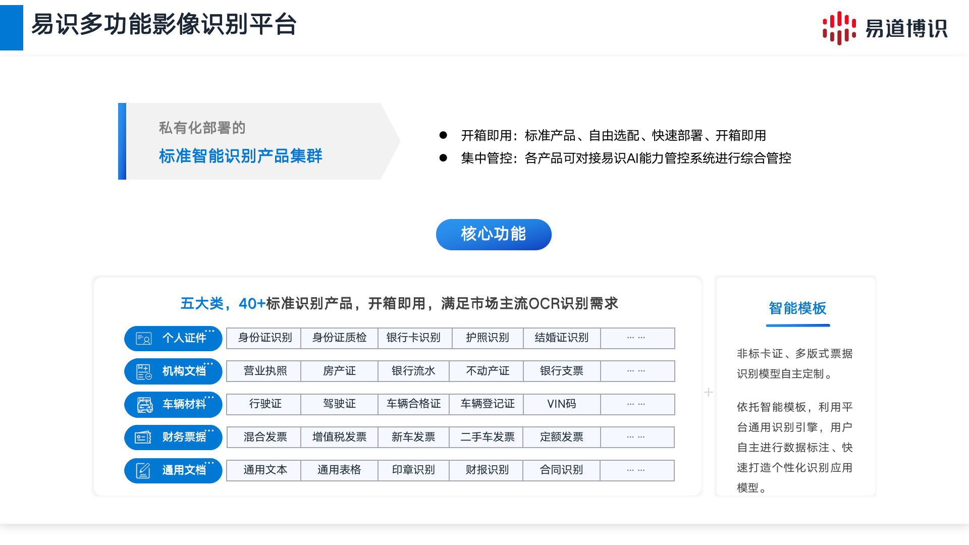 易識多功能影像識別平臺開箱即用,包含五大類,50+標(biāo)準(zhǔn)識別產(chǎn)品,自由選配、快速部署、開箱即用,滿足市場主流OCR識別需求。非標(biāo)卡證、多版式票據(jù)識別模型可自主定制,其依托智能模板,利用平臺通用識別引擎,用戶自主進行數(shù)據(jù)標(biāo)注、快速打造個性化識別應(yīng)用模型。此外,平臺各識別產(chǎn)品可對接易識AI能力管控系統(tǒng)進行綜合管控,實現(xiàn)數(shù)據(jù)、應(yīng)用、資源及系統(tǒng)等一體化管理。