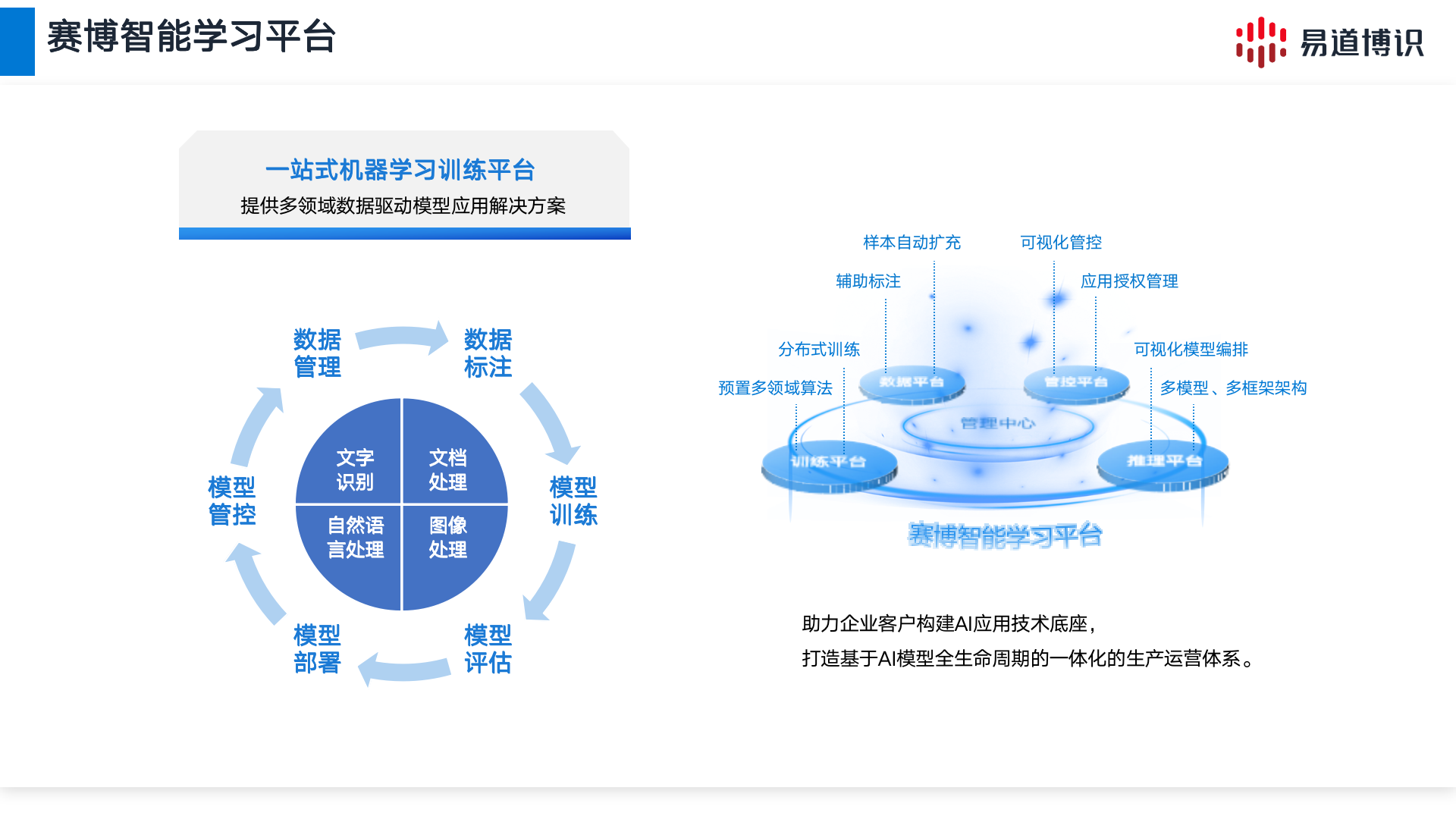 賽博智能學(xué)習(xí)平臺是基于最前沿AI技術(shù)打造地一站式機器學(xué)習(xí)訓(xùn)練平臺,可提供智能識別、圖像處理、文檔處理、自然語言處理領(lǐng)域數(shù)據(jù)驅(qū)動模型應(yīng)用的現(xiàn)場高效解決方案,客戶通過該平臺可自主完成數(shù)據(jù)標(biāo)注、模型訓(xùn)練、推理、部署、應(yīng)用全過程,助力金融機構(gòu)基于AI模型全生命周期建設(shè)標(biāo)準(zhǔn)化、一體化、體系化的生產(chǎn)運營體系。