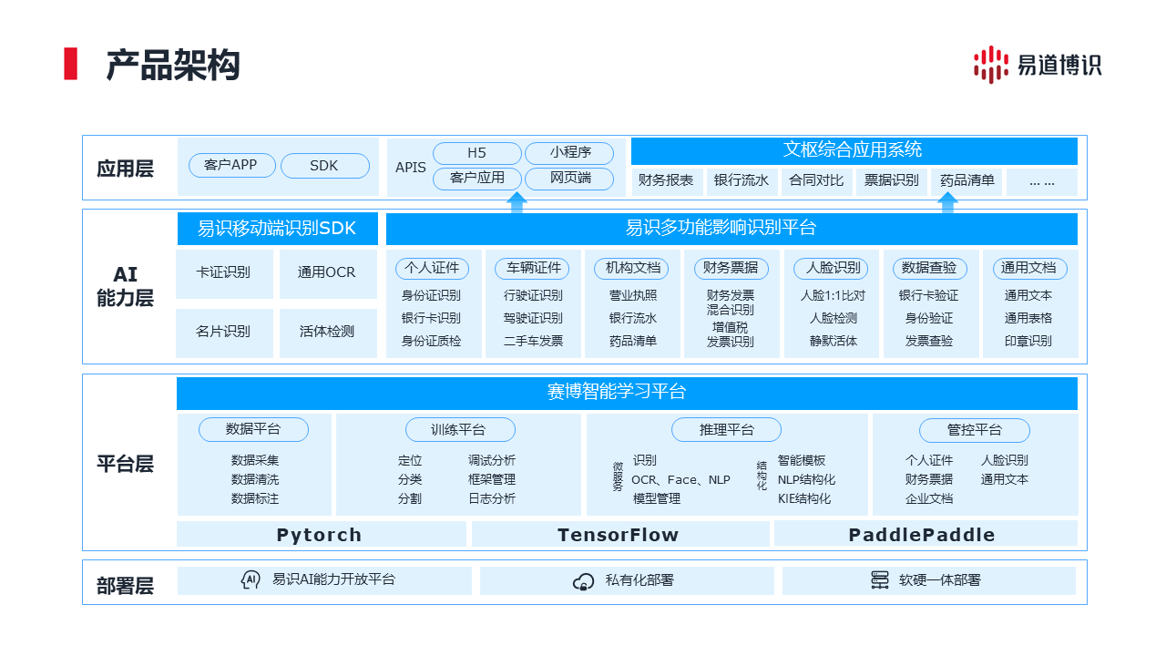 易道博識自成立以來一直致力于人工智能領(lǐng)域的技術(shù)研究與應(yīng)用開發(fā),為適應(yīng)國產(chǎn)化浪潮,易道博識自主研發(fā)全面適配信創(chuàng)產(chǎn)業(yè)智能文檔識別方案,依托賽博、易識、文樞及主流軟硬件產(chǎn)品基礎(chǔ)設(shè)施,為客戶提供基于信創(chuàng)環(huán)境的底層支撐能力,確??蛻粼诎踩沫h(huán)境下,實(shí)現(xiàn)對各類文檔的智能識別和處理,如財務(wù)報表、銀行流水、證件、票據(jù)等,提高金融機(jī)構(gòu)的工作效率,降低人工成本和安全風(fēng)險。