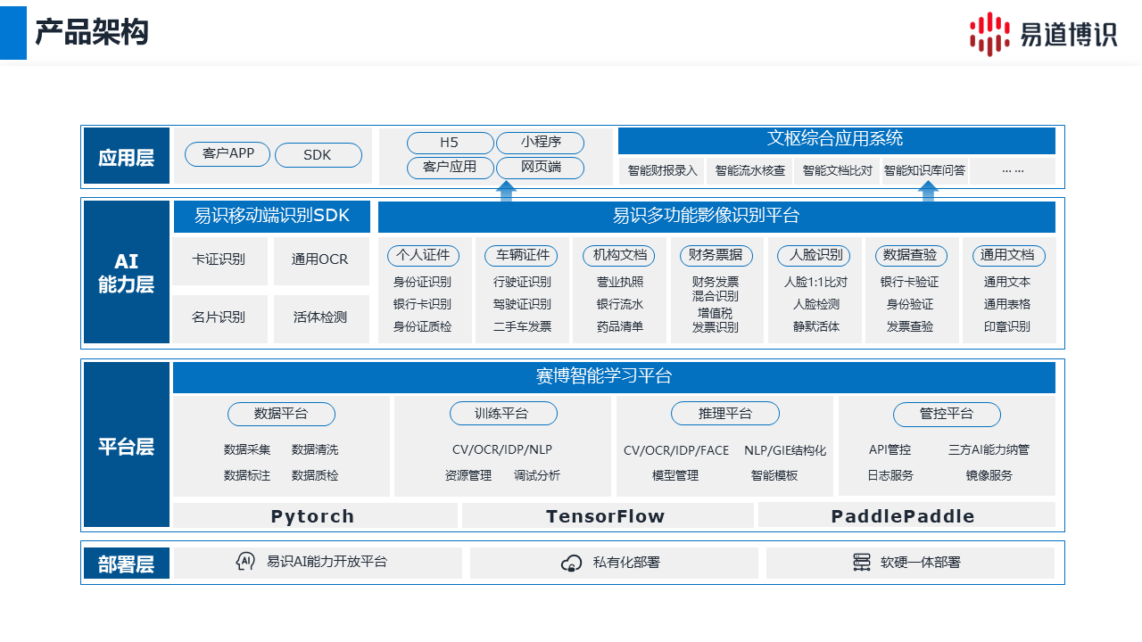 易道博識(shí)自2013年成立以來,始終致力于人工智能領(lǐng)域的技術(shù)研究與應(yīng)用開發(fā),通過自主研發(fā)的智能文字識(shí)別、智能文檔處理、智能圖像處理和自然語言處理四大核心技術(shù),主要產(chǎn)品包括“易識(shí)”——標(biāo)準(zhǔn)化智能識(shí)別產(chǎn)品集群、“賽博”——一站式機(jī)器學(xué)習(xí)平臺(tái)和“文樞”——文檔識(shí)別與數(shù)據(jù)深度應(yīng)用系統(tǒng),形成了完整的AI全棧解決方案。目前易道博識(shí)已為數(shù)百家金融機(jī)構(gòu)、通信、能源、地產(chǎn)等眾多行業(yè)大客戶提供智能化產(chǎn)品與服務(wù)。
