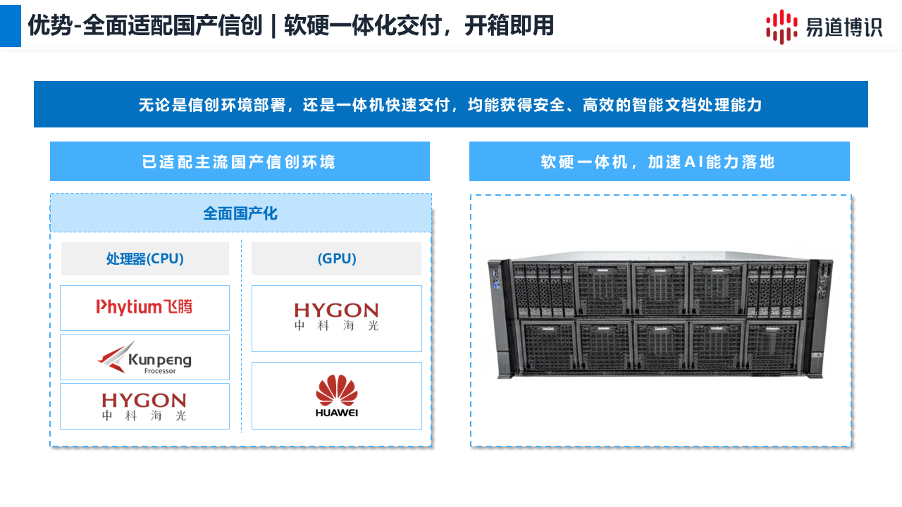 GIE大模型已全面適配主流國產(chǎn)化軟硬件環(huán)境,為金融機構(gòu)提供安全、合規(guī)、自主可控的智能文檔處理能力。能無縫、穩(wěn)定地運行在基于鯤鵬、飛騰、海光、龍芯等國產(chǎn)CPU,以及統(tǒng)信UOS、麒麟軟件等國產(chǎn)操作系統(tǒng)的服務(wù)器平臺上,而且可提供經(jīng)過適配優(yōu)化的軟硬一體化解決方案。