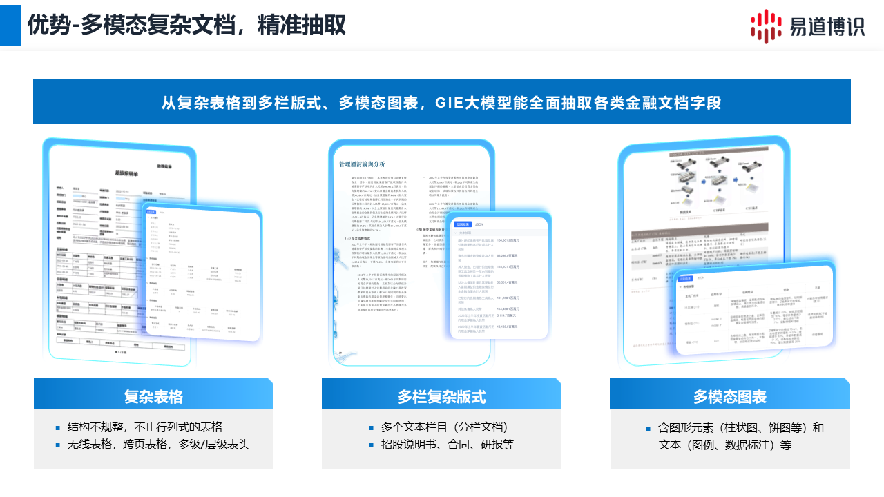 為解決上述問題,易道博識推出了GIE(通用信息抽?。┐竽P停瑢崿F(xiàn)了從“文本識別”到“內(nèi)容理解”的轉(zhuǎn)變。它能深度解析文檔的版面布局、邏輯結(jié)構(gòu)和元素關(guān)聯(lián),實現(xiàn)對任意版式文檔的信息抽取。