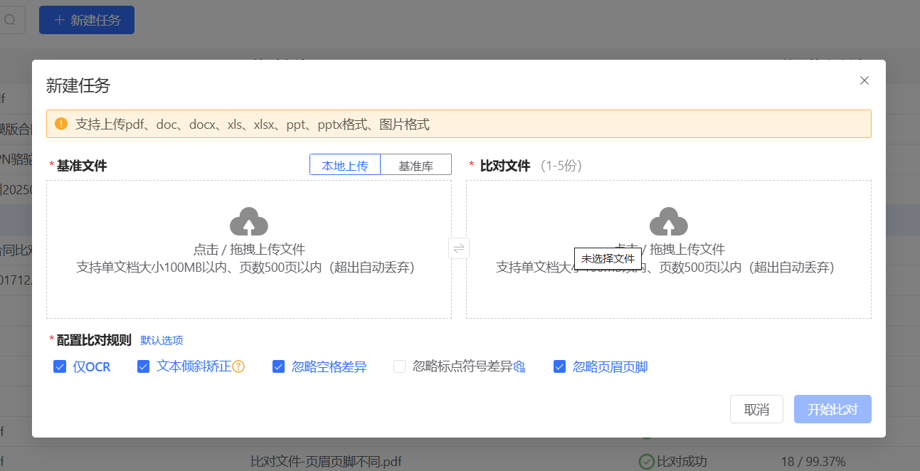 ●靈活的比對模式: 支持多任務(wù)并行,可同時上傳多個文檔與一個基準文件進行比對,并能自定義比對規(guī)則(如忽略標點、空格差異)。