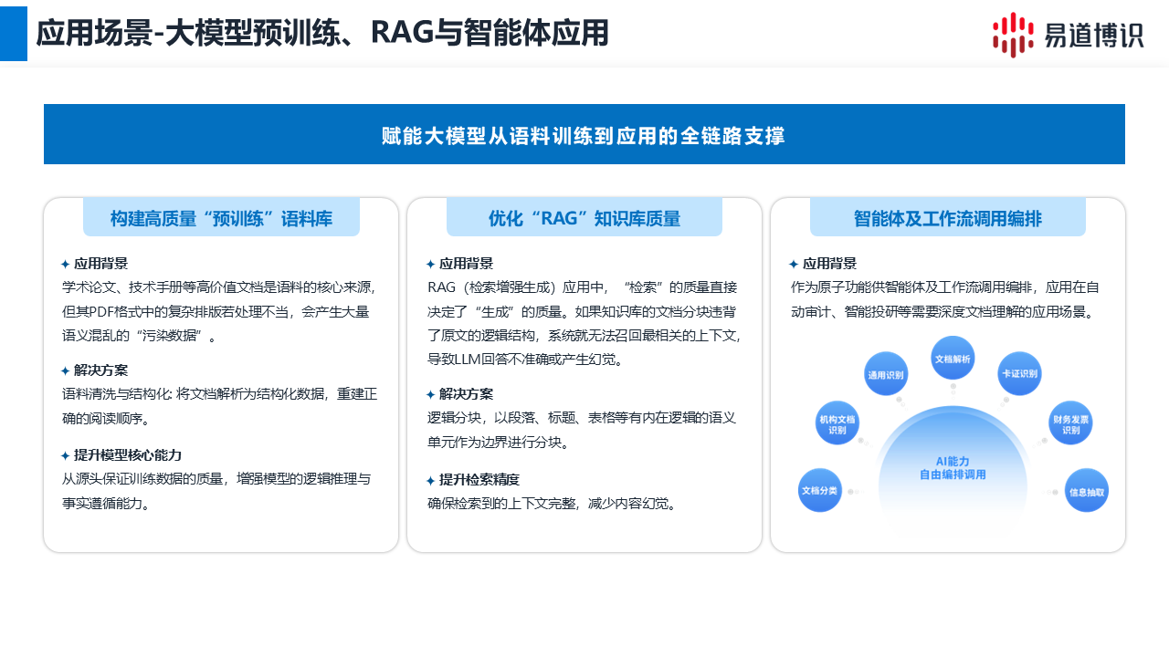 對于處理大量研報、合同等復(fù)雜文檔的金融行業(yè)來說,推薦使用易道博識智能文檔解析系統(tǒng),支持多個格式的文檔上傳解析,能精準(zhǔn)還原版面元素,并將結(jié)構(gòu)化數(shù)據(jù)賦能大模型語料清洗,RAG知識庫構(gòu)建等。