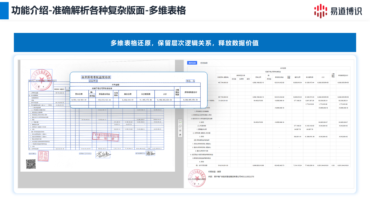 針對財報中常見的多級表頭、嵌套單元格等“多維表格”,易道博識智能文檔解析系統(tǒng)能夠深入解析其復雜的層級與隸屬關系。它不僅是提取數(shù)據(jù),更是完整保留了數(shù)據(jù)之間的層次邏輯,將復雜的表格轉(zhuǎn)化為機器可讀的結(jié)構(gòu)化數(shù)據(jù)(如JSON),真正釋放了深藏于表格中的數(shù)據(jù)價值。
