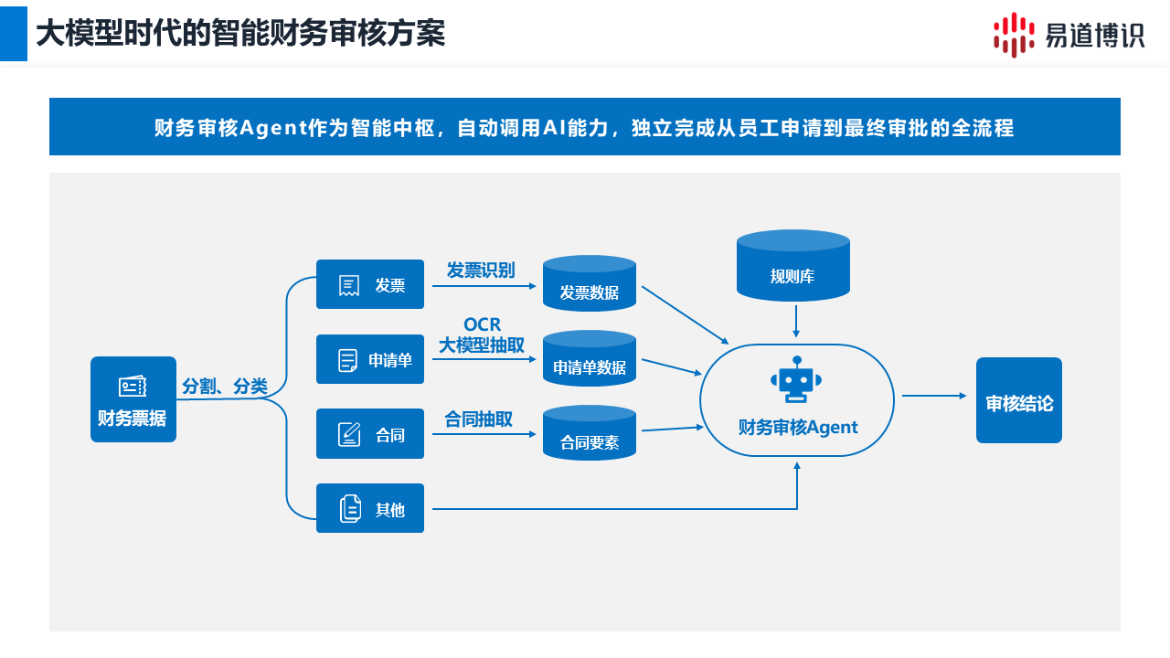 易道博識智能文檔工作流(DocFlux),通過“大小模型協(xié)同抽取+自然語言配置規(guī)則”,為財務智能審核場景提供了一套標準化的落地方案。