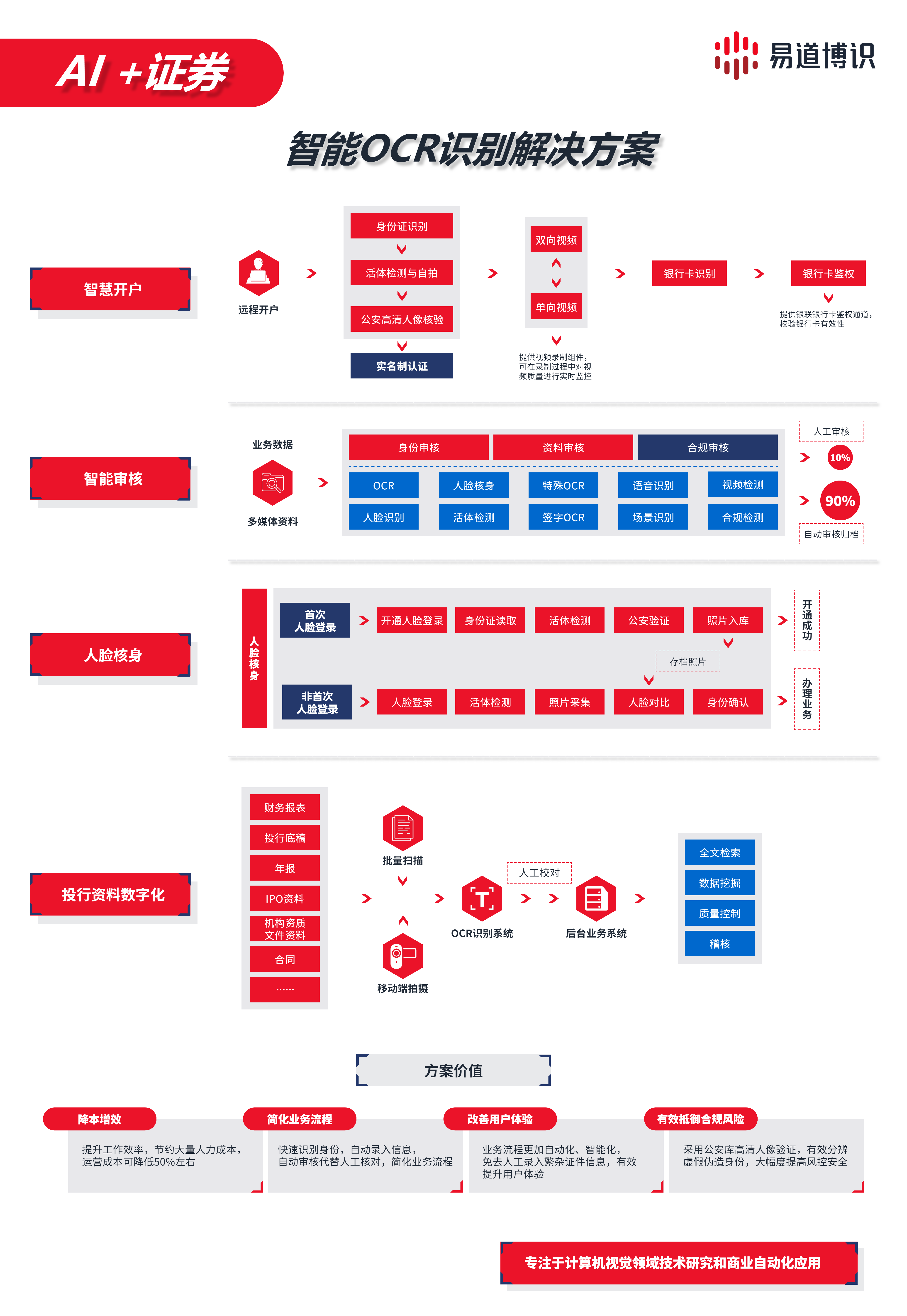 迄今為止,易道博識已經(jīng)成為證券領(lǐng)域合作覆蓋范圍最廣、方案最成熟、識別產(chǎn)品最豐富的人工智能企業(yè),與七成以上的券商都有合作,廣受好評。易道博識提供的OCR識別+人臉識別相結(jié)合的非現(xiàn)場開戶智能方案在券商行業(yè)內(nèi)廣泛應(yīng)用。