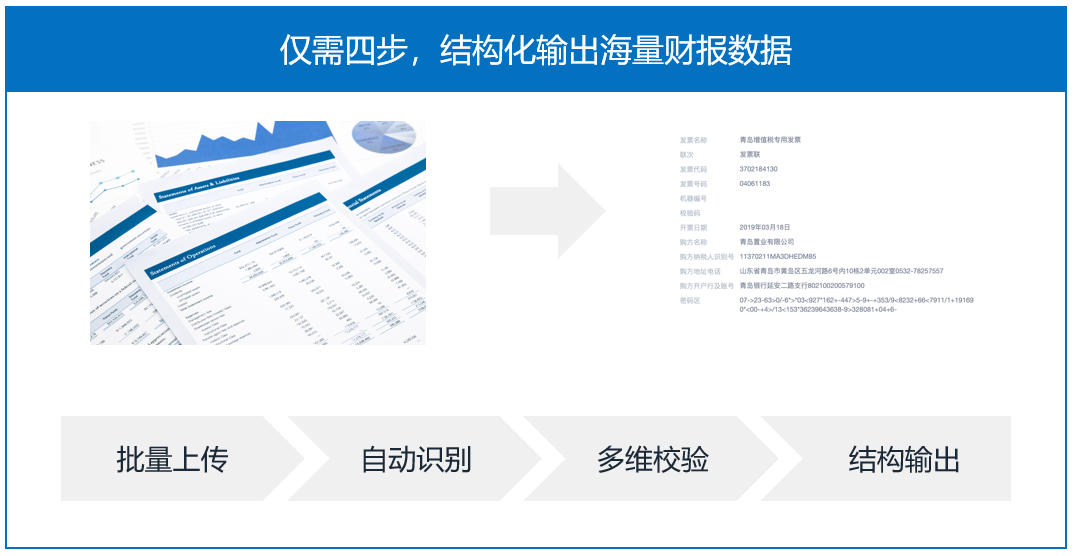 該系統(tǒng)利用易道博識自主研發(fā)的基于深度學(xué)習(xí)的OCR識別技術(shù),可實現(xiàn)整張財報快速識別、自動錄入,相較人工方式工作效率可提升超20倍。以往手工錄入3份完整財報需耗時2小時以上,而現(xiàn)在完成同等工作僅需5分鐘。
