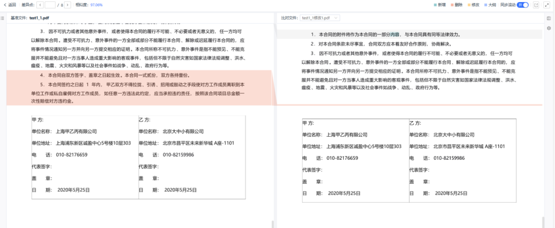 從合同的初稿到最終版本,都能通過智能文檔比對系統(tǒng)進(jìn)行智能比對,包括條款的增刪、修改等,有效避免人工比對時可能出現(xiàn)的疏漏和低效問題,使得銀行能夠更有效地管理合同,規(guī)避“陰陽合同”問題,確保合同文本的準(zhǔn)確性和完整性,提升業(yè)務(wù)運(yùn)作的整體效率和安全。