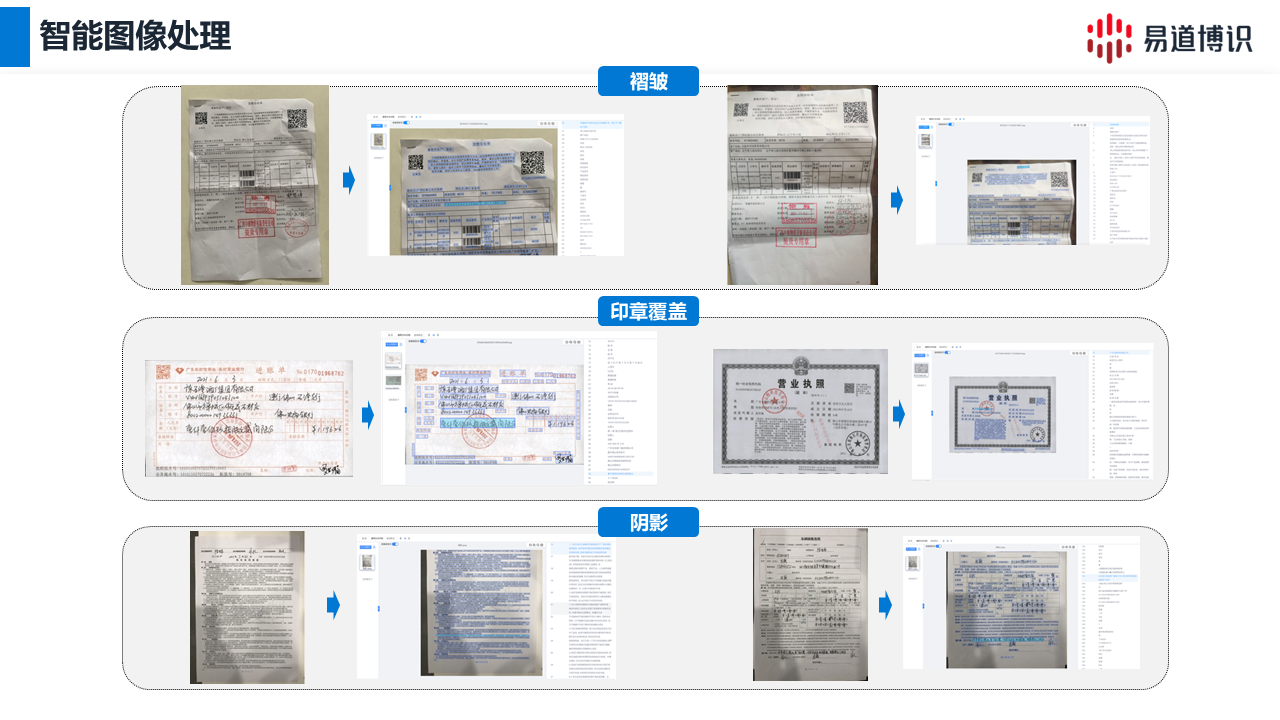 ● 智能圖像處理:針對銀行業(yè)務(wù)中常見的低質(zhì)量圖像,系統(tǒng)內(nèi)置智能圖像預(yù)處理功能,可自動完成圖像增強、陰影與水印去除、印章干擾識別等操作,有效應(yīng)對文檔褶皺、印章重疊、低對比度等復(fù)雜情況,從而顯著提升識別準(zhǔn)確率。