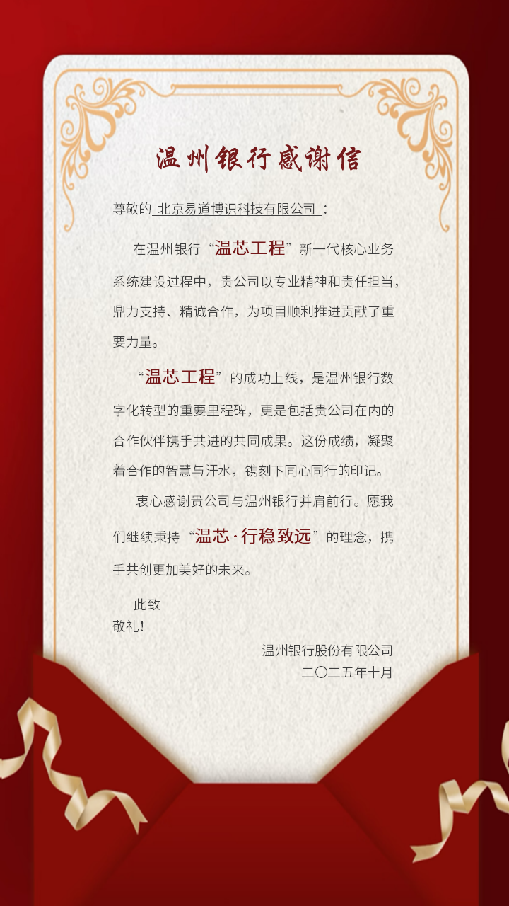 近日,易道博識收到了來自溫州銀行的感謝信,信中對易道博識團隊在溫州銀行新一代核心業(yè)務(wù)系統(tǒng)“溫芯工程”建設(shè)過程中所展現(xiàn)的專業(yè)能力與服務(wù)精神給予了高度評價。
