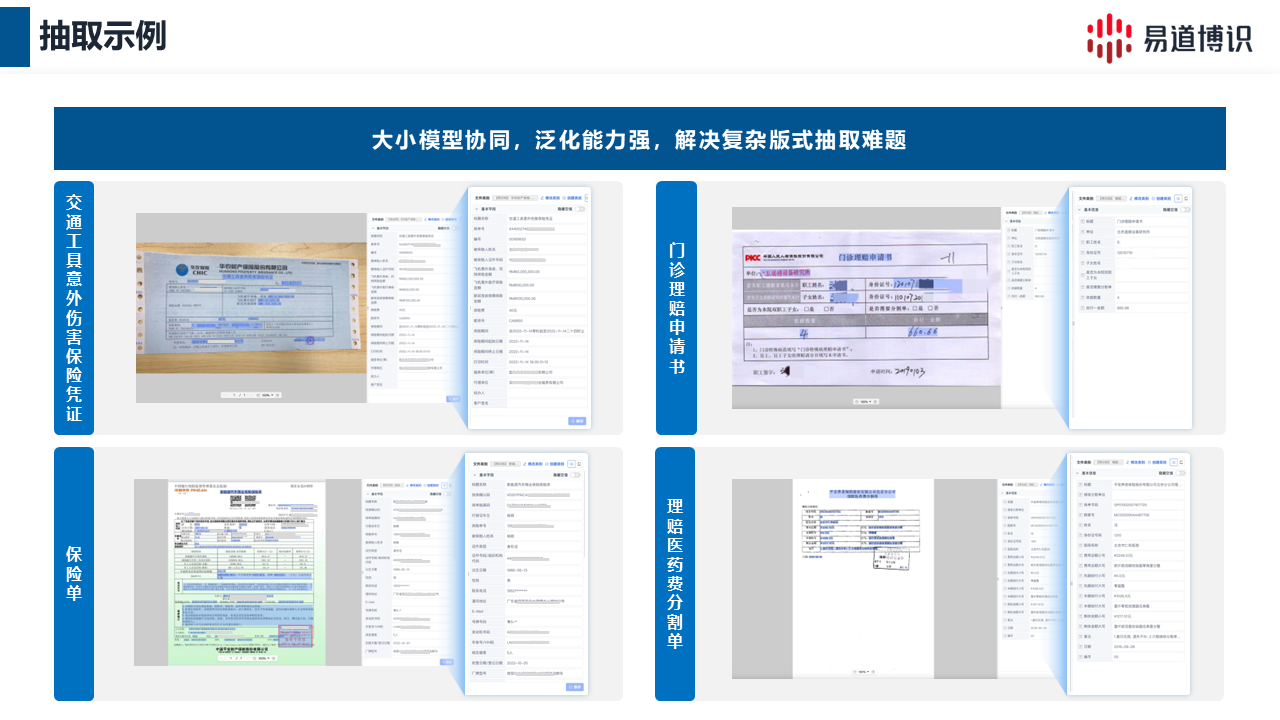易道博識(shí)"AI+保險(xiǎn)智能審核解決方案",依托智能文檔工作流DocFlux,大模型賦能理賠審核全鏈路,實(shí)現(xiàn)理賠材料自動(dòng)分類及抽取、規(guī)則100%覆蓋。